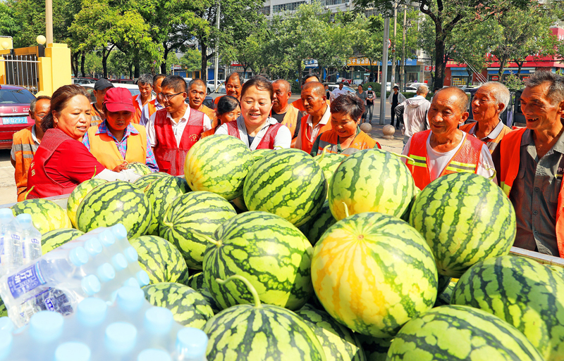 许昌雷锋爱心社团志愿者为环卫工送西瓜和矿泉水